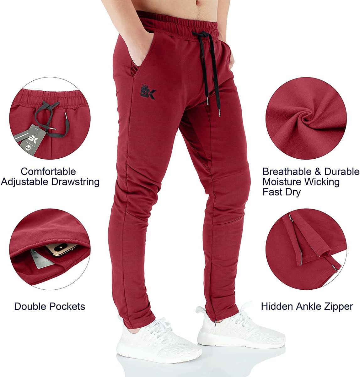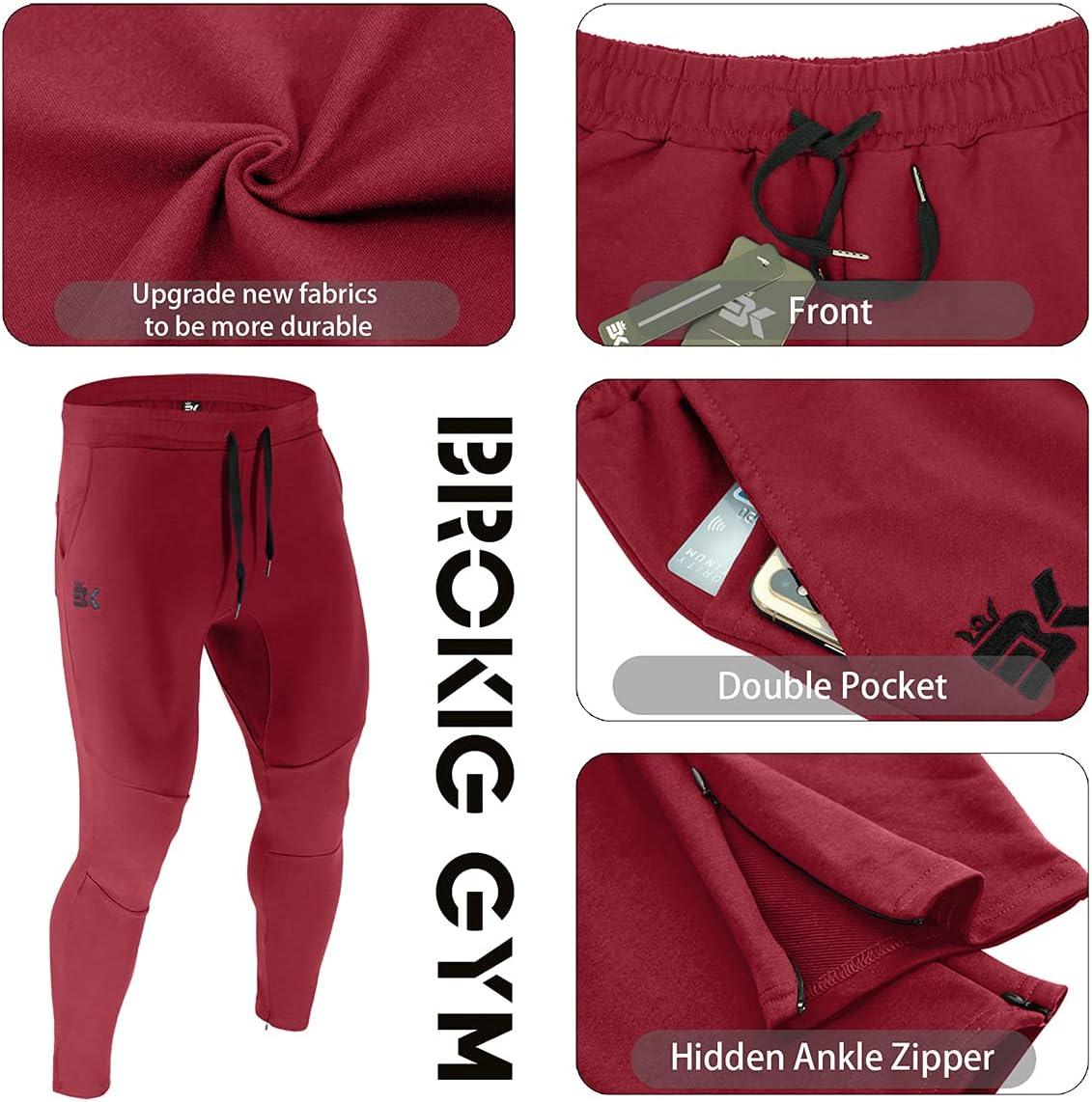 BROKIG Mens Jogger Sport Pants, Casual Zipper Gym Workout Sweatpants Pockets(Burgundy)